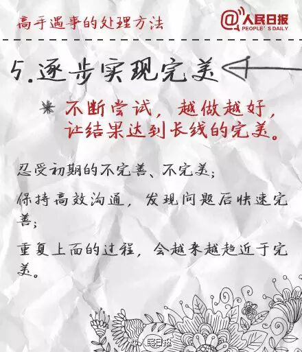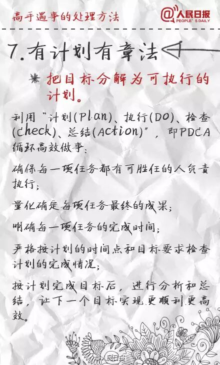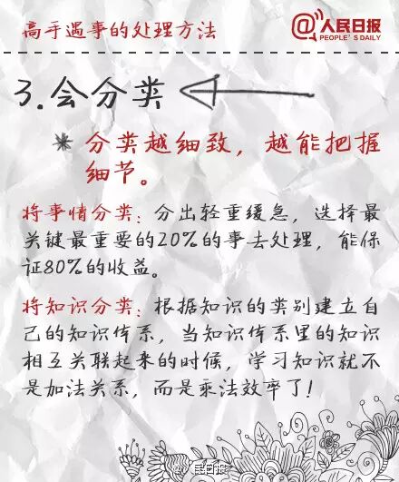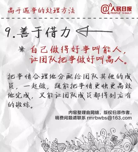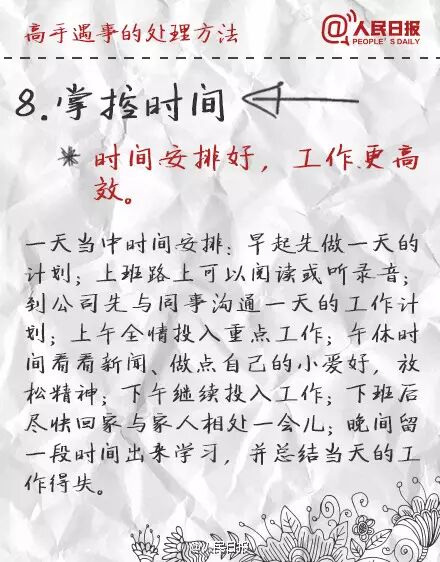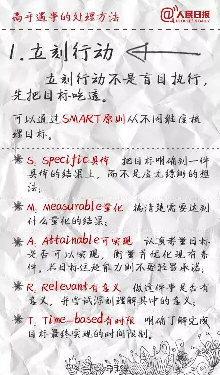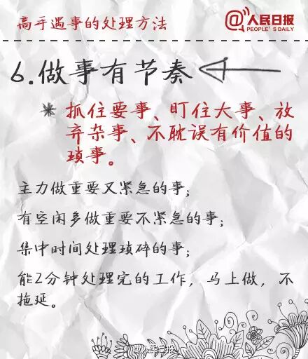 ①立刻行動,但不盲目執行;②會休息,不僅指睡眠,更要學會"換腦";③做事有節奏,抓住要事、盯住大事、放棄雜事,能2分鐘處理完的工作,馬上做,不拖延;④學會掌控時間,重要時段、零碎時間都合理利用;⑤善於借力,自己做好叫能人,讓團隊把事做好叫高人。學習,提高!